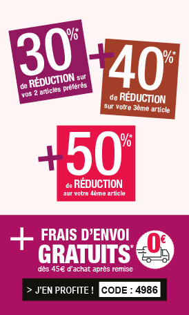 Remise de 30% sur vos 2 articles préférés + 40% sur le 3ème + 50% sur le 4ème + Frais d'envoi GRATUIT dès 45€* après remise: